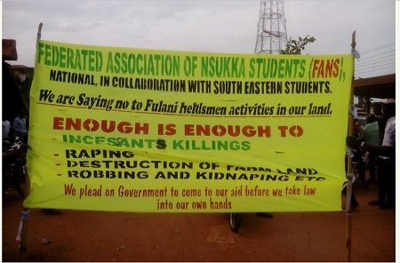 Students in the Fulani-ravaged Enugu State are currently staging a protest to halt the movement of Fulani nomadic pastoralist in the area. Students of Nsukka origin under the auspices of the Federated Association of Nsukka Students (FANS) are currently protesting the invasion of Fulani herdsmen in various communities in Enugu State.