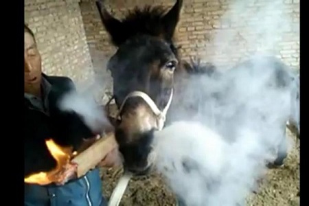 The animal was seen beside a man holding a giant rolled "cigarette" containing firewood up to one of the donkey's nostrils June 13 in Zhangye, Gansu Province.