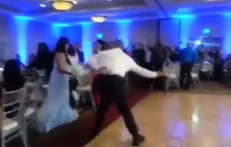The groom, while trying to stage an acrobatic display as he danced, landed on his wife and the two of them went down.