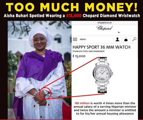 "In what appears to be another display of brazen opulence, wife of the President of Nigeria, Mrs. Aisha Buhari has been spotted wearing a £15,000 Chopard Happy Sport 36 MM stainless steel diamonds encrusted watch, raising more questions about the frugality, anti-corruption and man of the people image that got her husband elected as President of Nigeria in March 2015.