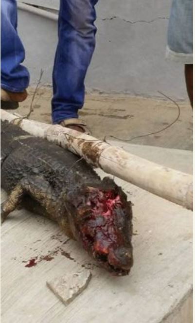 A huge alligator has been killed and used to cook a sweet meal by a group of boys in Gbagada area of Lagos. A group of young men in Gbagada swampy area of Lagos have caught a huge alligator and used it for a delicious meal. The boys who took to social media to share pictures of the alligator revealed that they caught it near a river.