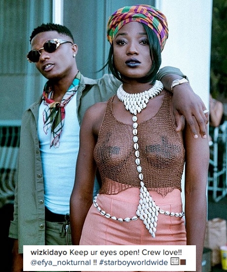 The above photo posted on Instagram by Wizkid to his over 2.5 million followers, shows the 'Baba Nla' crooner put his hand on the songstress who is wearing a rather revealing top which exposed her bare breasts covered in only a bit of black tape.