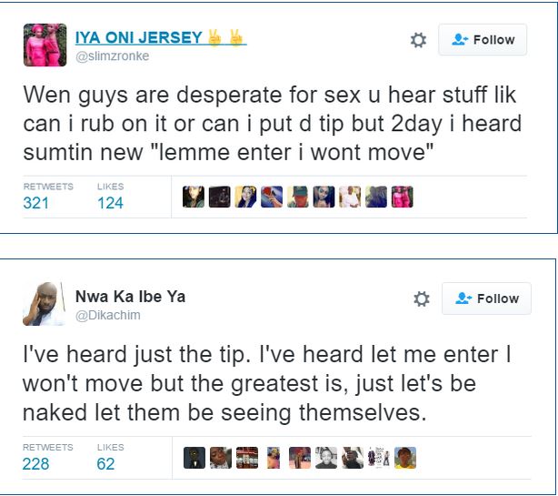 Social media users, Slimz Ronke and Dikachim have thrilled Twitter users with their knowledge of awkward responses from s*xually starved men in desperate bids to have s*x with their reluctant partners possibly for the first time.