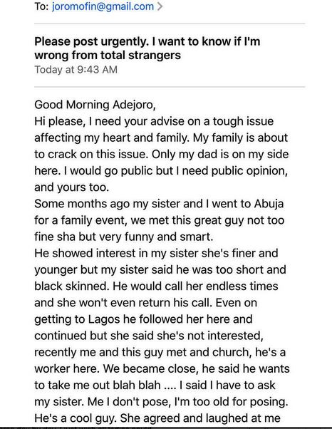 Joro Olumofin has posted two different stories of Nigerian blood sisters who are currently entangled in a love web with the same man whose father is very influential.