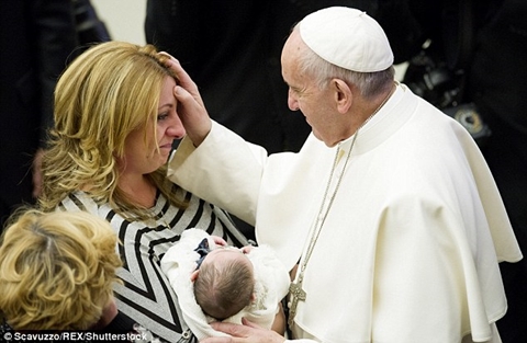 Pope Francis touching the head of a mother during his weekly audience