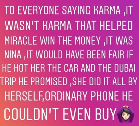 "Lailai we go share that money by force, he should have compensated her, we all know Miracle didn’t do the writeup, we know who wrote it for him, cause he’s still begging , he enjoy London things change, omoojuorolari, your coins from big brother go soon finish no worry, but the truth is he cheated NINA, by still leading her on daily, I have proof so don’t push me, telling her to keep you people private and you go publicly to pull this stunt, argue with your ancestors.