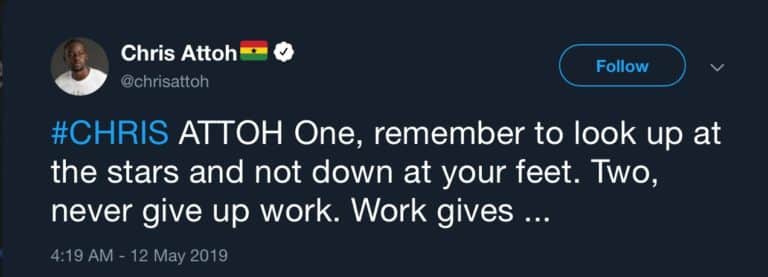 “#CHRIS ATTOH One, remember to look up at the stars and not down at your feet. Two, never give up work. Work gives.”